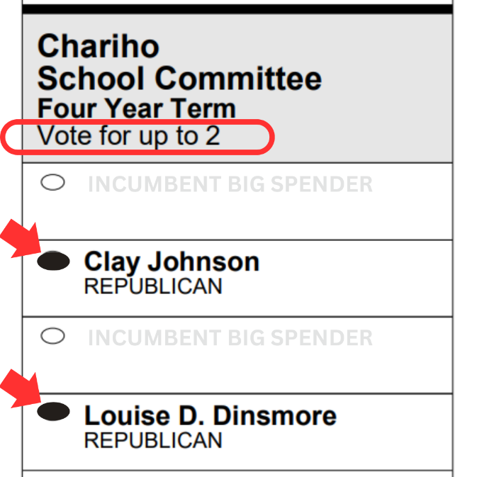 When you vote, you will be able to select two names for school committee on the ballot. We ask for your support. Vote Louise Dinsmore and Clay Johnson!